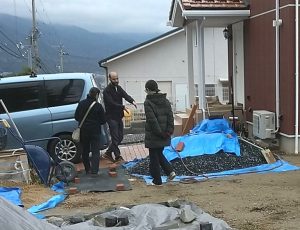 黒い自然石のピンコロ石を並べて玄関のアプローチができてました