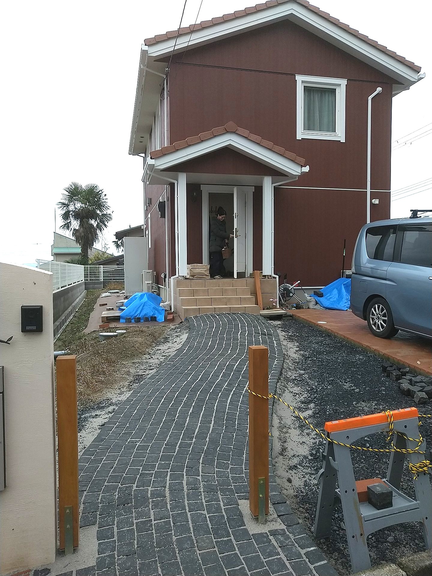 黒い自然石のピンコロ石を並べて玄関のアプローチができてました